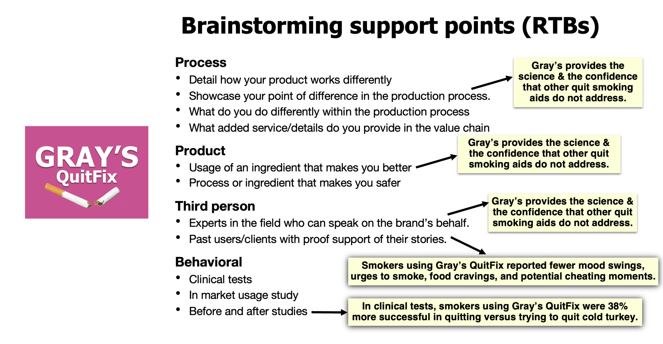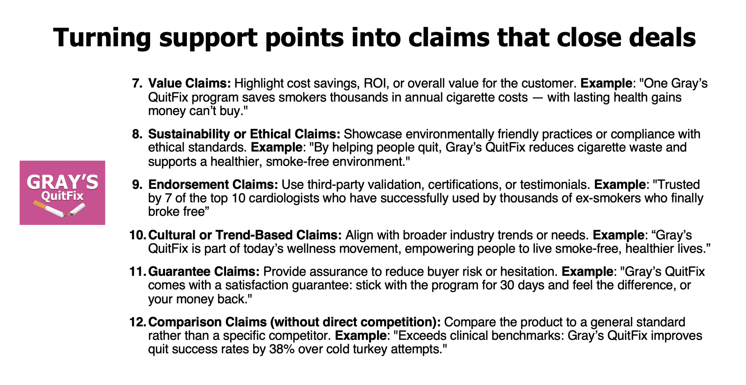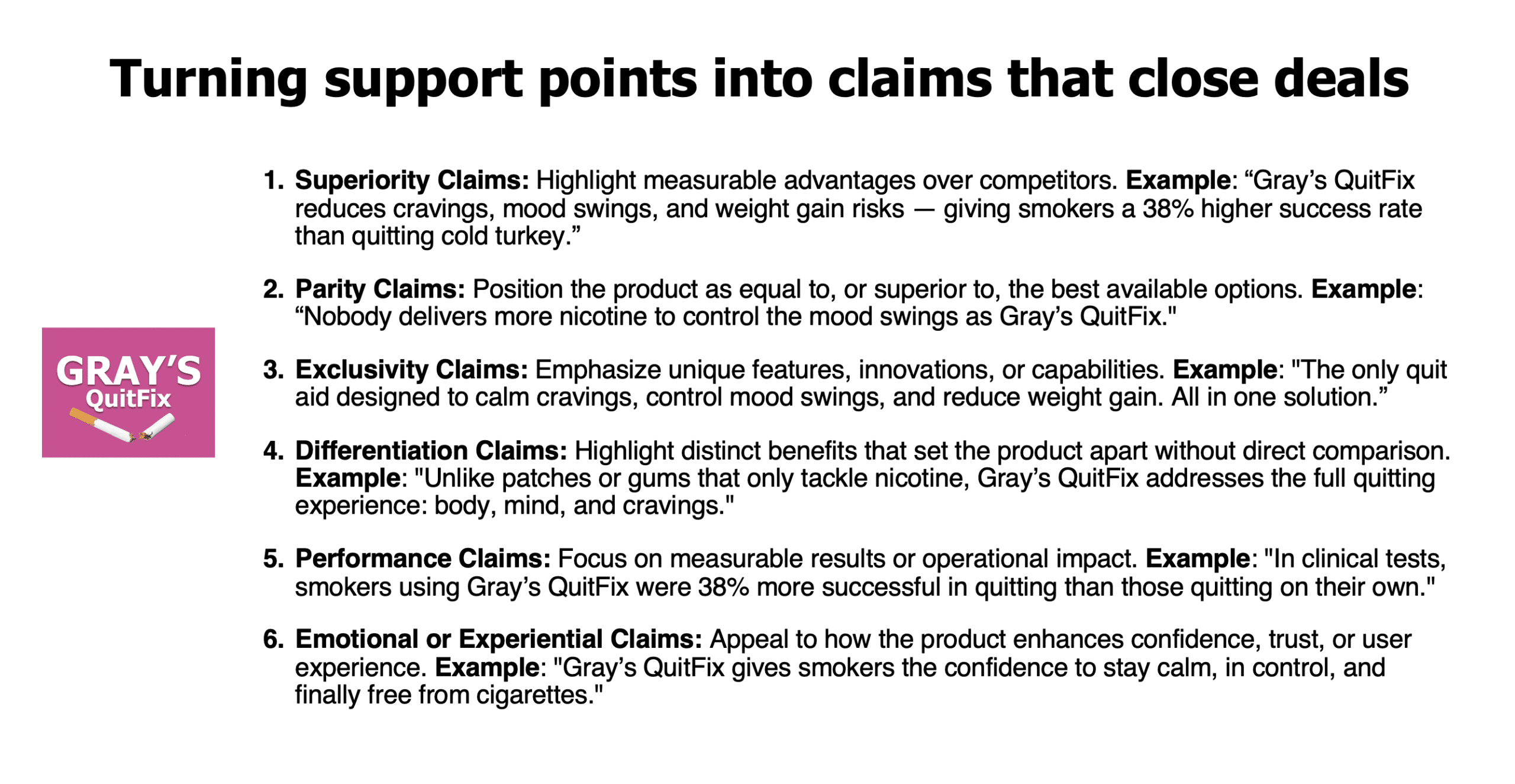 - Parity claims reinforce that you’re equal to or better than the best: “Nobody delivers more nicotine to control mood swings than Gray’s QuitFix.”