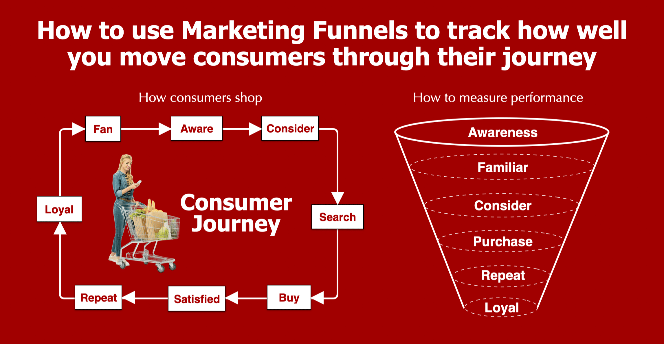 A classic marketing funnel measures how successful a brand moves consumers through their purchase journey, including stages such as awareness, familiarity, consider, purchase, repeat, and loyalty. From a strategic view, the brand funnel tells you where your brand is now, and when analyzed with intelligence, it provides hints as to where you can go next. The marketing funnel is also called a sales funnel or brand funnel.